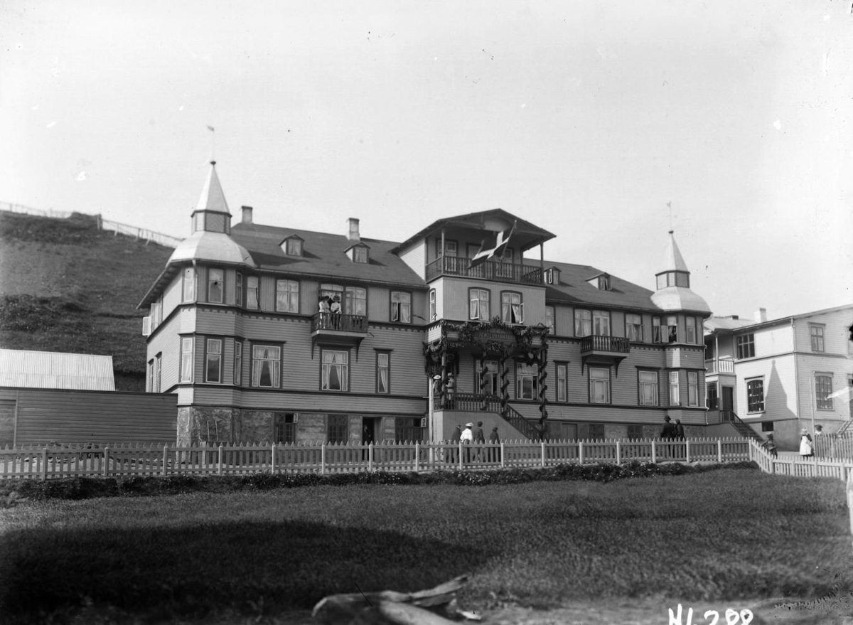 Hér er Hótel Akureyri skreytt við konungsheimsókn 1908.