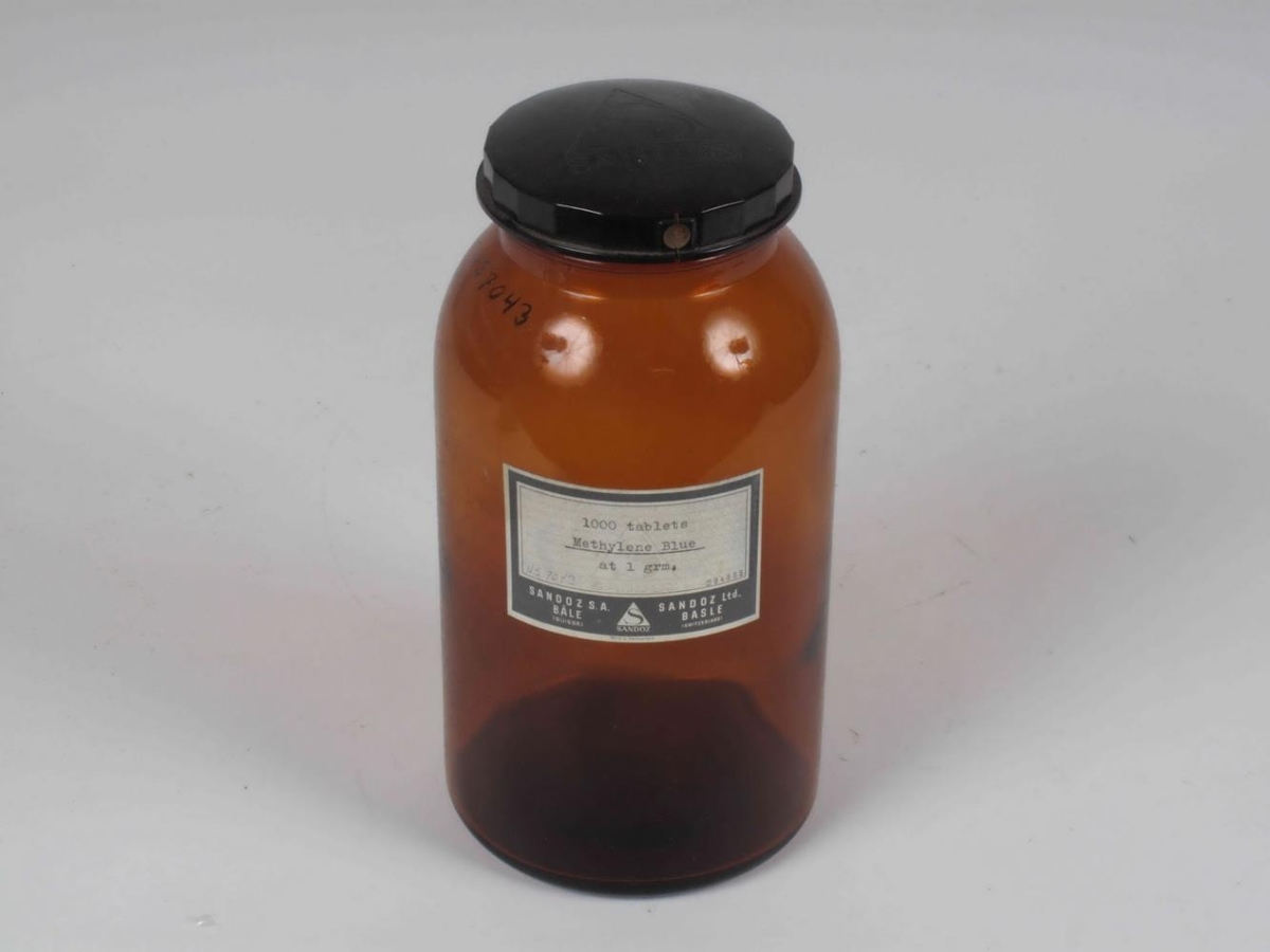 Brún krukka, miði: 1000 tablets / Methylene Blue / at 1 grm.