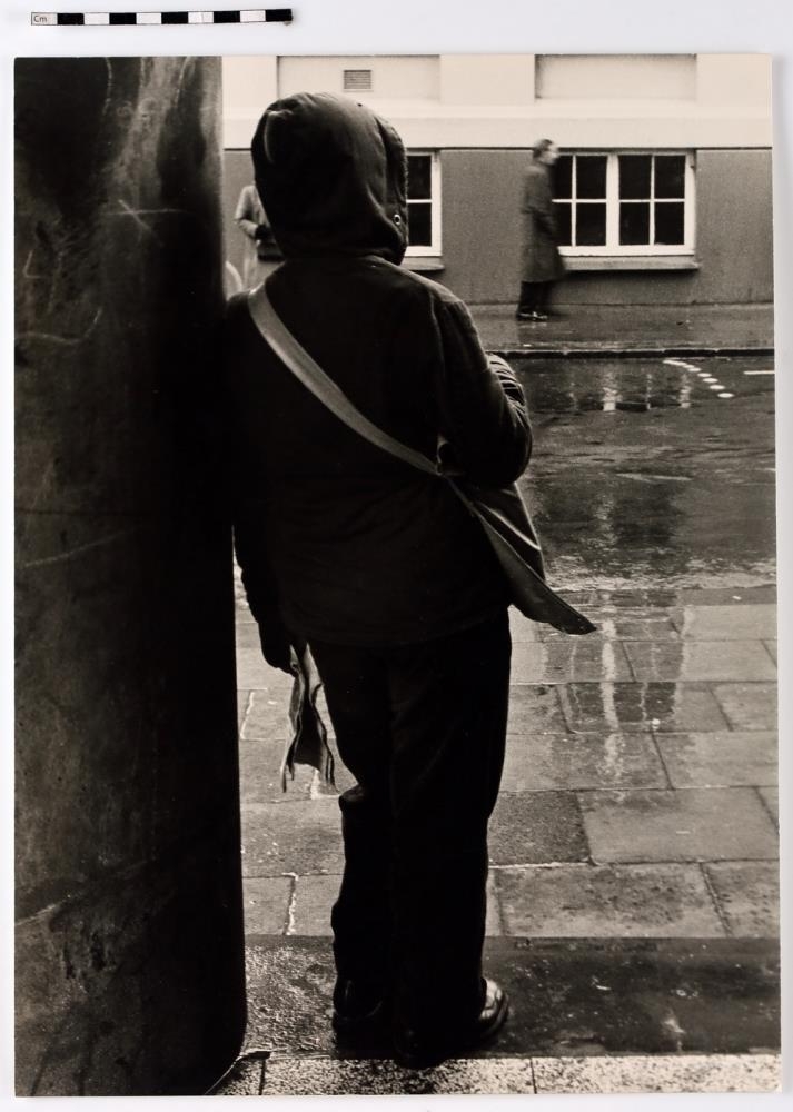 Baksvipur blaðsölubarns upp við súluna á Reykjavíkurapóteki. Aftan á myndinni stendur: "Freddy Lustsen, Klapparstíg 40, Reykjavik, Island" Neðst er skr. með bláum penna: "No 25"