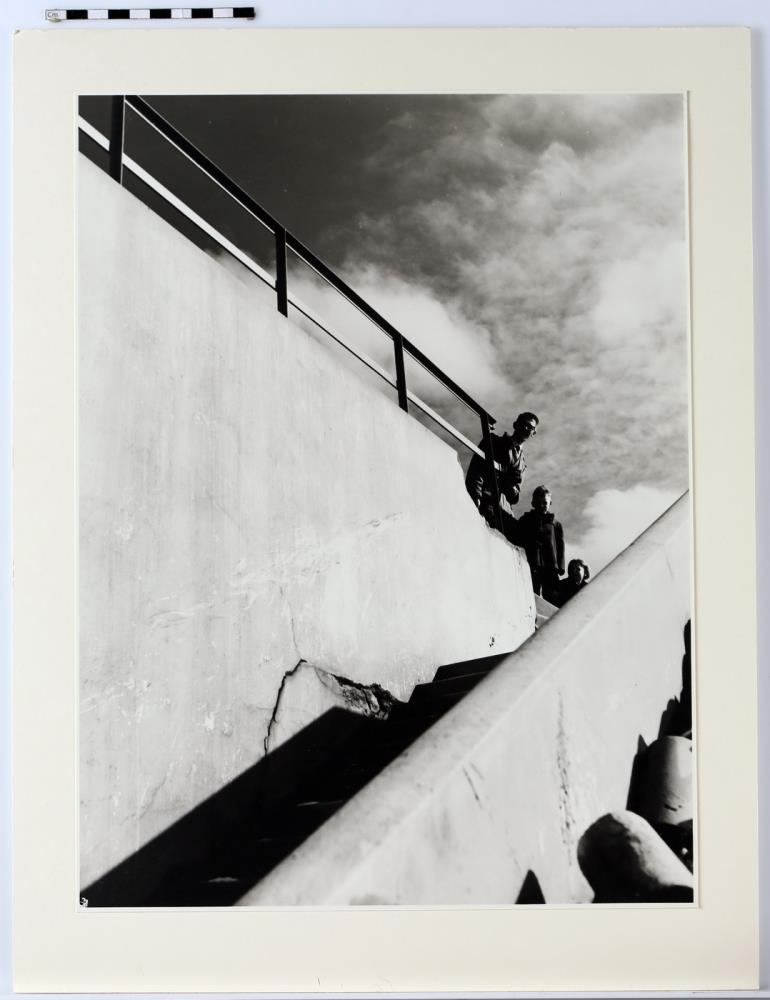 Karlmaður og tvö börn við handrið ofan við steinsteyptar tröppur.