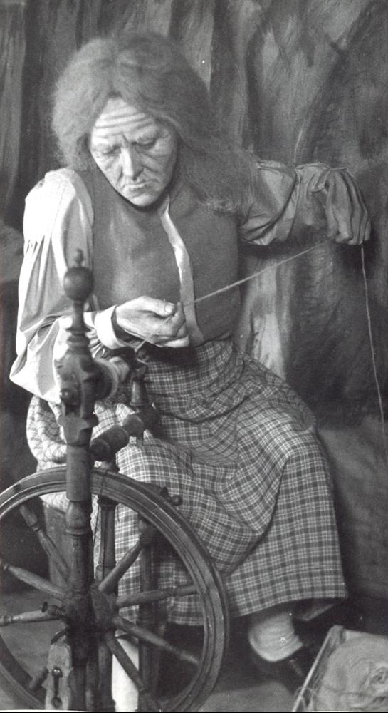 Leikkona í hlutverki sínu situr við að spinna ull. Hulda Runólfsdóttir í hlutverki Úlrikku í 3. þætti leikritsins Kinnarhvolsdætrum sem Hafnarfjarðarleikhúsið sýndi veturinn 1950- 1951.