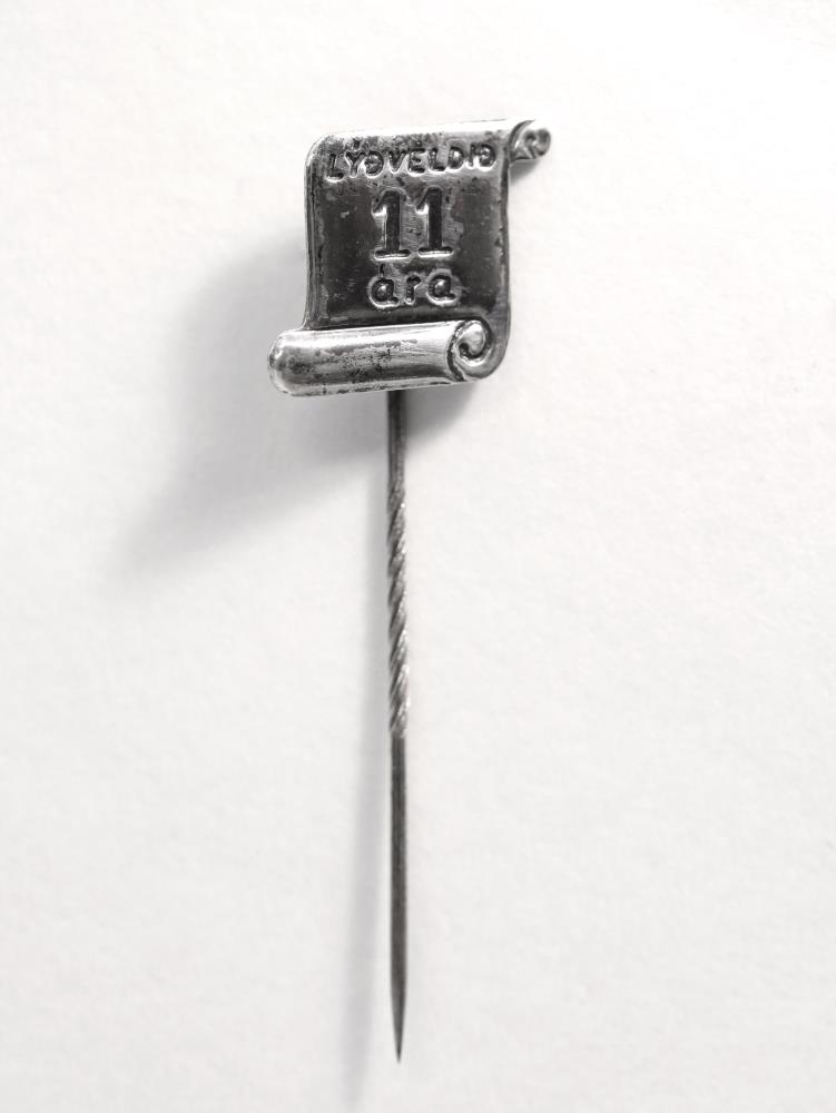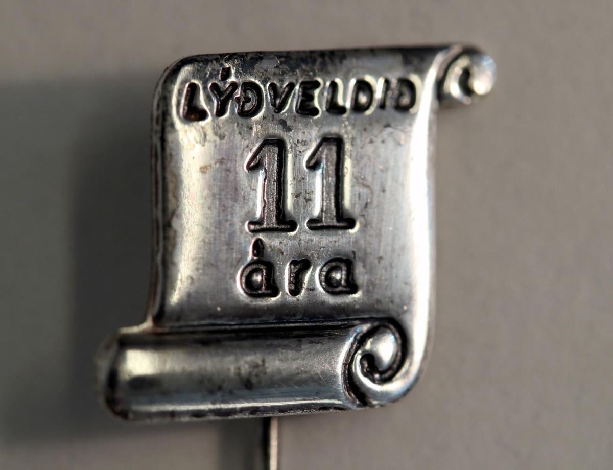 Barmmerki úr silfri, framleitt í tilefni af 11 ára afmæli lýðveldisins Íslands og er því frá árinu 1955. Merkið er á prjóni en sjálf platan er í líki pappírsrúllu (pappírsrullu) og í það er þrykkt: