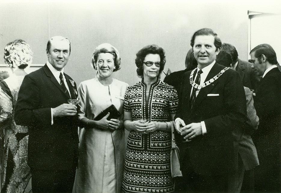 Geir Hallgrímsson, borgarstjóri, ásamt konu sinni Ernu Finnsdóttur. Óþekktur karl og kona standa við hlið þeirra.