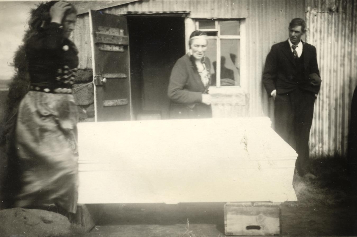 Jarðarför Guðrúnar Sigurðardóttur vinnukonu á Syðri-Fljótum í Meðallandi árið 1953. Líkkista og fólk á hlaðinu við gamla torfbæinn þar.