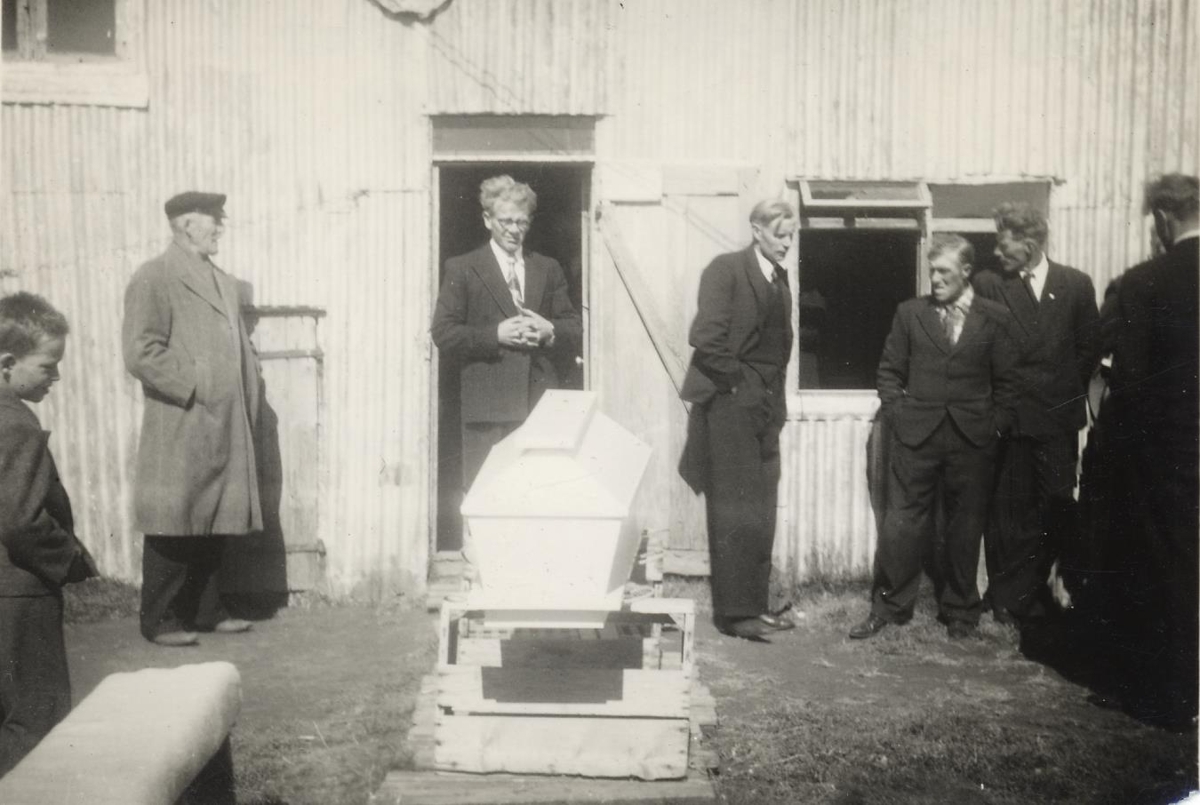 Jarðarför Guðrúnar Sigurðardóttur vinnukonu á Syðri-Fljótum í Meðallandi árið 1953. Líkkista hennar og fólk á hlaðinu við bæinn.