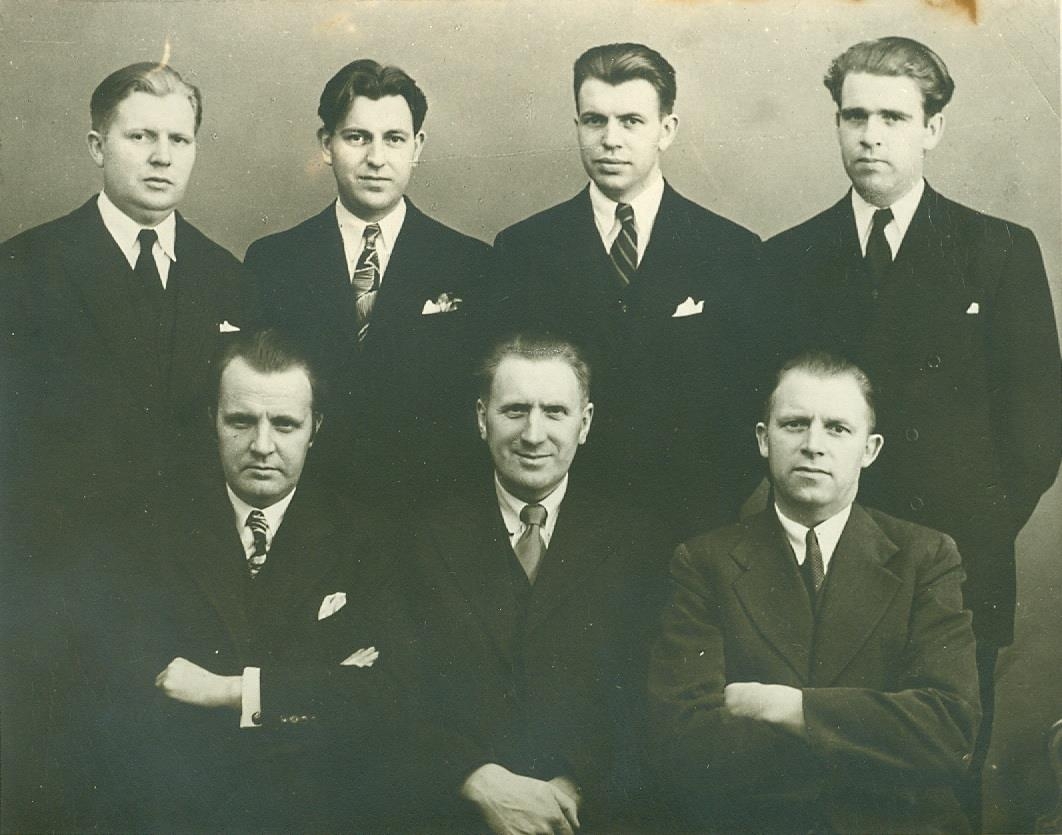 Sjö karlmenn uppstilltir, bræður. Efri röð frá vinstri: Jörundur, Gunnar, Svavar, Bergur Pálssynir. Neðri röð frá vinstri: Gestur, Hreinn og Bjarni Pálssynir.