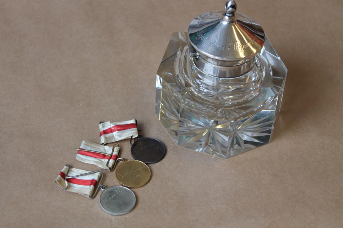 10029 Blekbytta úr kristal með silfurloki og áletruninni Sýsluglíma Mýrasýslu 1932-fegurðarverðlaun. Gripnum fylgja þrír verðlaunapeningar frá Sýsuglímunni 1950 úr eigu Bjarna Bachmann.