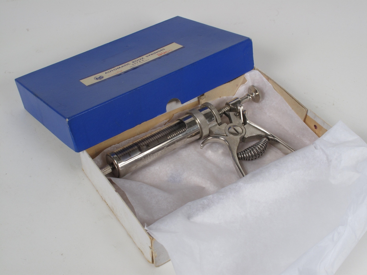 Stór sprauta. Teikning er á spjaldinu. Á kassanum stendur: Automatic Roux Syringes / 2078 R / Made in Germany.
