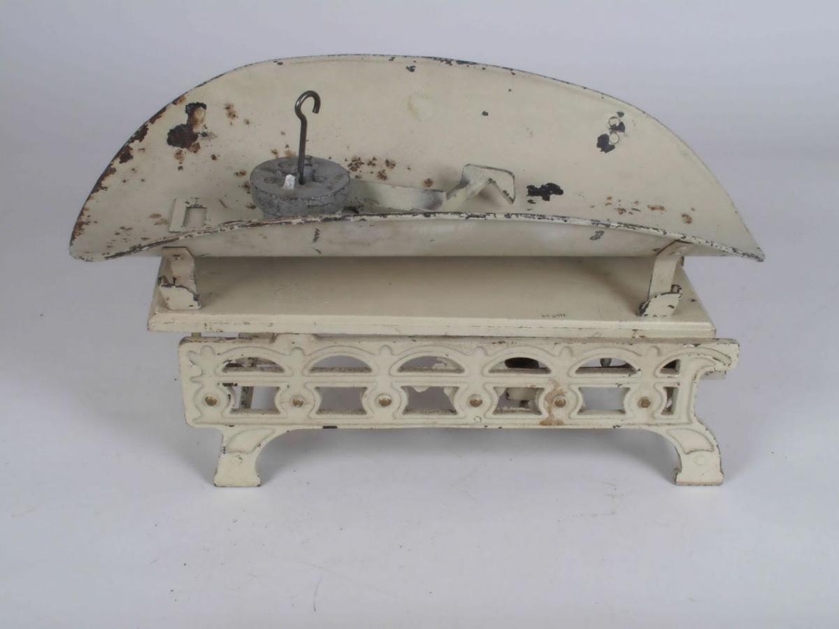 Hvít barnavog. Barnið er lagt í eins konar skál, úr stáli.