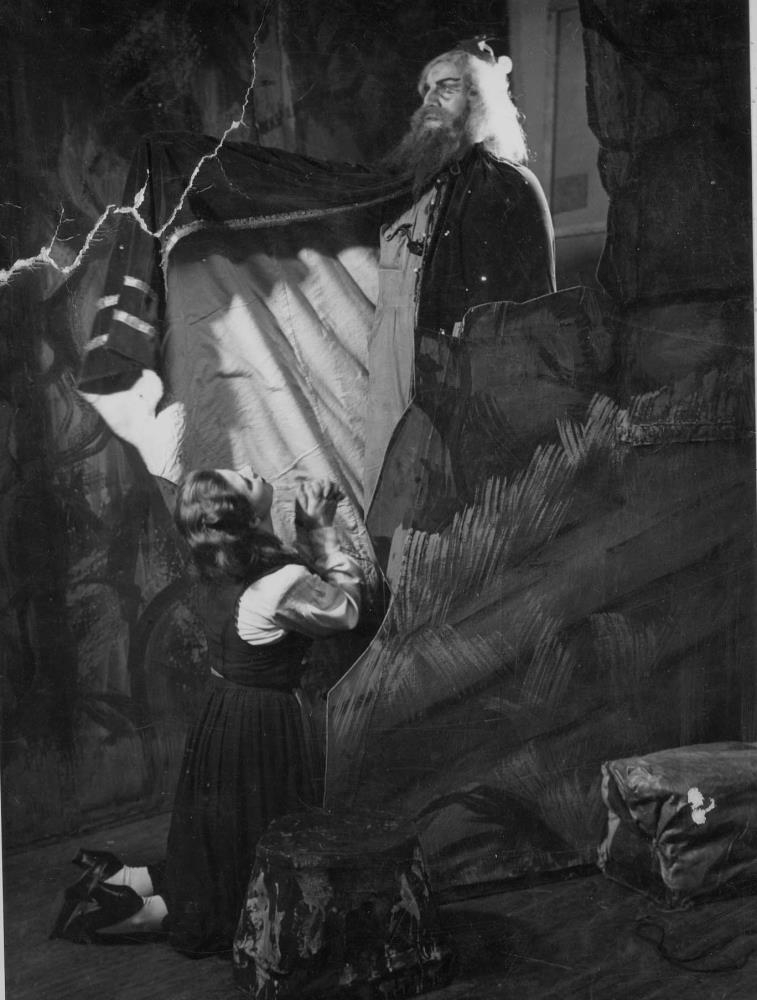Leikfélag Hafnarfjarðar. Tveir leikarar í hlutverkum sínum í Kinnarhvolssystur. Leikstjóri Jón Norðfjörð. Höfundur er Johannes Carsten Hauch , fæddur 1790.Hann andaðist 1872, þá áttatíu og tveggja ára.Hann var mikilsmetinn rithöfundur í Danmörku á sinni tíð. Leikritið var fyrsta verkið sem var sett upp í Bæjarbói en það var árið 1945.