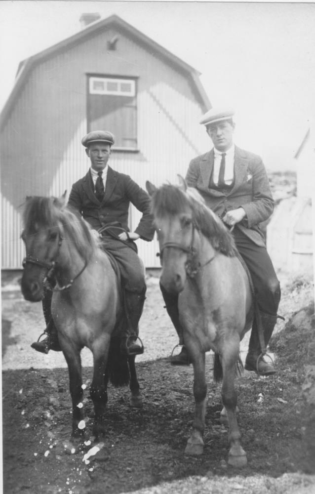 Þorgils Guðmundur og Árni M. Mathiesen við hesthúsið að Strandgötu 25. Hafnarfjörður