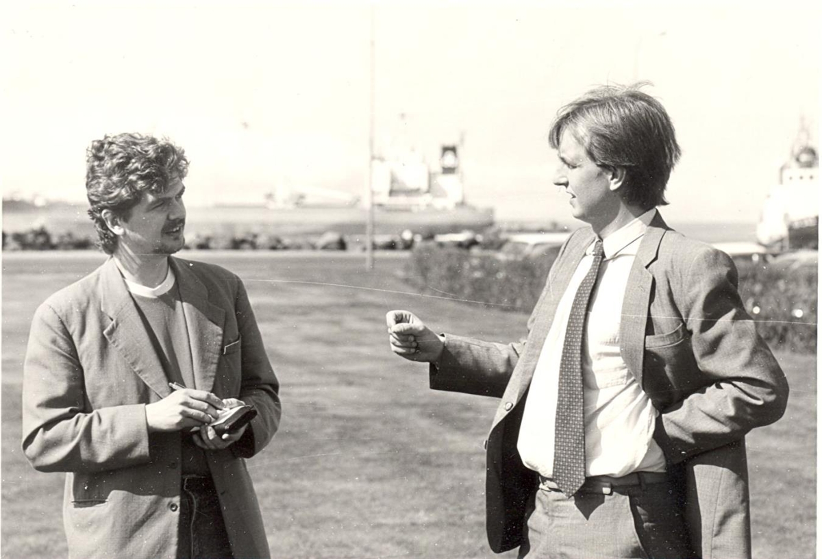 Tveir góðir Hafnfirðingar fyrir neðan Hafnarfjarðarkirkju til vinstri er Sigurður Friðþjófsson og til hægri er Guðmundur Arni Stefánsson.