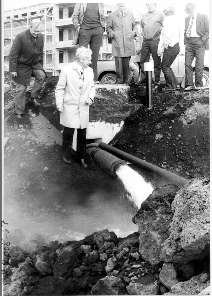 Hitaveituframkvæmdir skoðaðar. Efst og lengst til hægri er Guðmundur Guðmundsson, en á leiðinni niður eru Árni Grétar Finnsson og fyrir neðan hann er Kristinn Ó. Guðmundsson bæjarstj. Myndin kom til Byggðasafnsins frá Bæjarskrifstofunum.