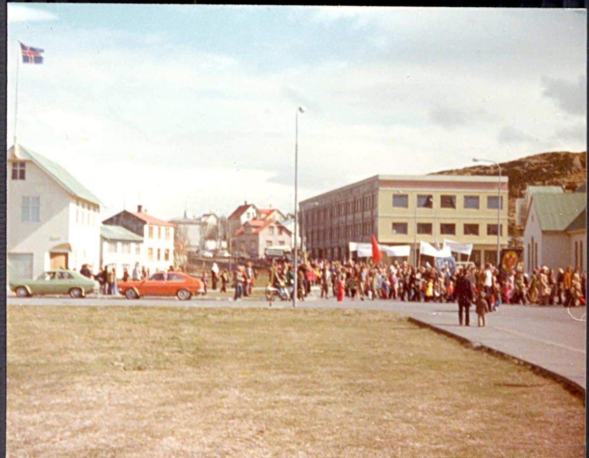 Mynd úr safni Kristjáns Eyfjörð Guðmundssonar, sjómanns á Merkurgötu 13. Gefið af dóttur hans, Rakel Kristjánsdóttur. Myndin er tekin fyrir 1981, líklega á Sjómannadaginn. Séð inn Lækjargötu, Dvergur hægra megin, hús Einars Þorgils vinstra megin.