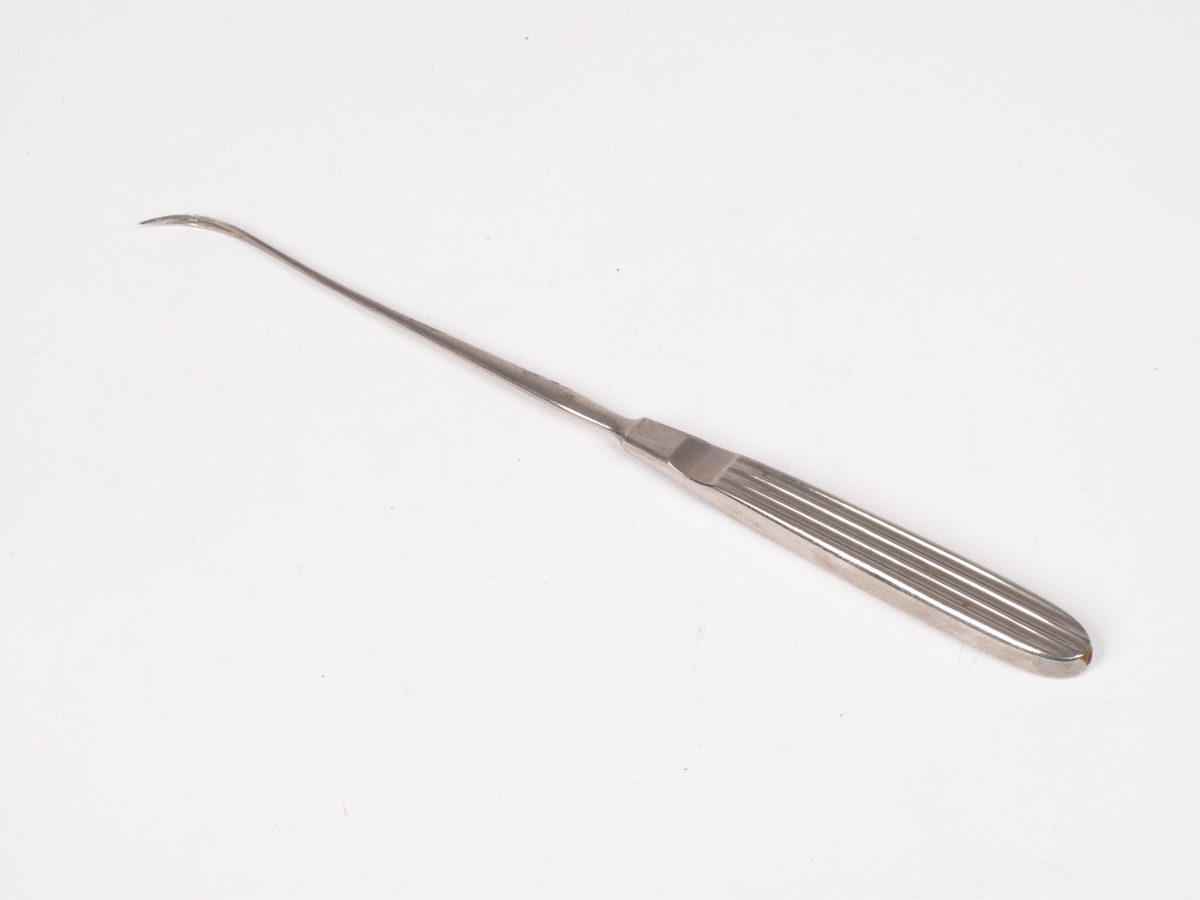Saum nál á skafti, lítið bogin, beitt, auga ekki opnanlegt. Ekkert framleiðandamerki. Sjá: V Mueller & Co, bls. 130-131. Aesculap I, B-4833 Pfriemen nach Pancet zur Drahtnaht. Úr eigu Bjarna Snæbjörnssonar læknis (Blöndal/Jónsson I 1970, bls. 161).