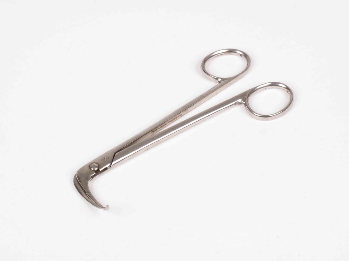 Vinkilbeygð, krómuð og merkt: SWEDISH HOSPITAL. Sjá: V Mueller & Co, bls. 379, GO 2004-06. Lík Aesculap I p. 74 B-4991 A en án læsingar, fräparier und Ligaturklemme n. Laufman. Hjörur: A. Úr eigu Bjarna Snæbjörnssonar læknis Stærð skráð í Sarp 2: "4+13.5 cm".
