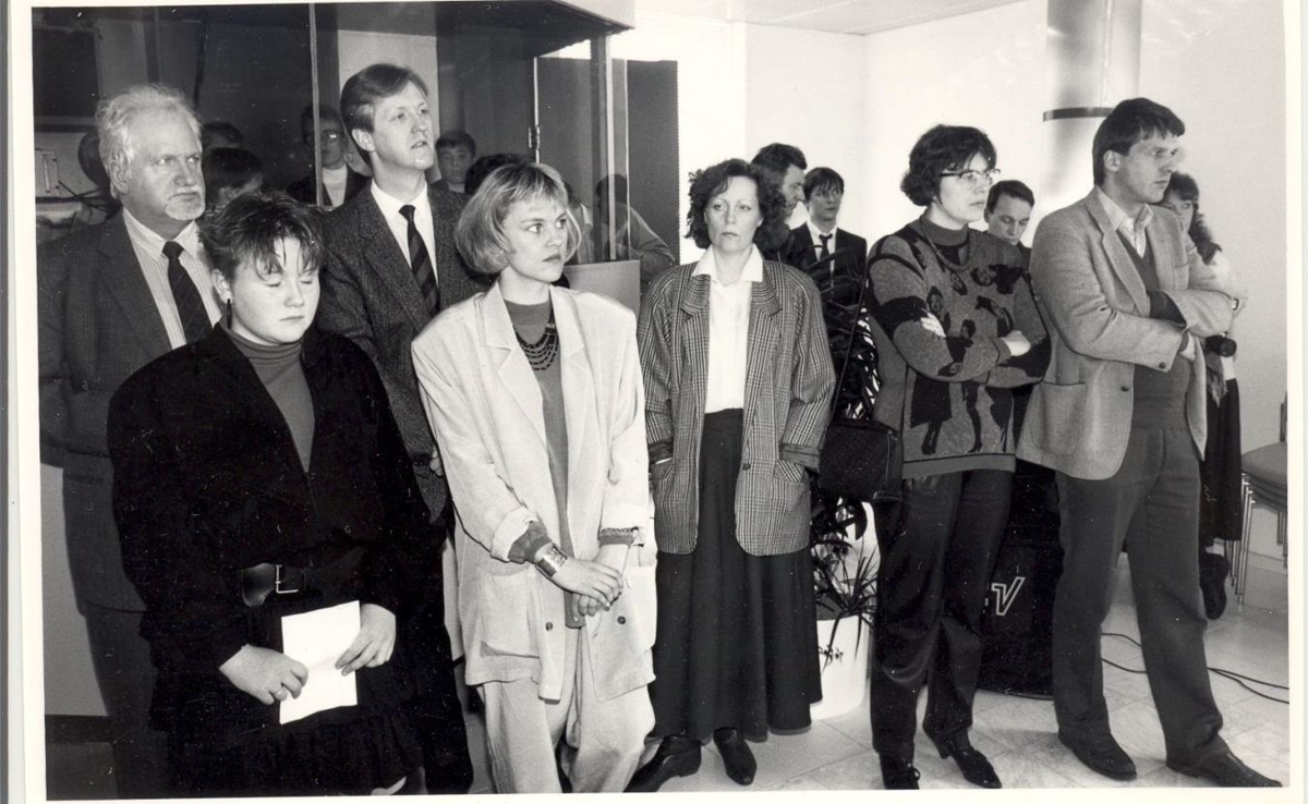 Lengst til vinstri á myndinni er Hörður Zóphaníasson, konan 5. frá vinstri er Valgerður Guðmundsdóttir sá sem er lengst til hægri er Tryggvi Harðarson. Myndin gæti verið frá samkomu hjá Alþýðuflokknum.