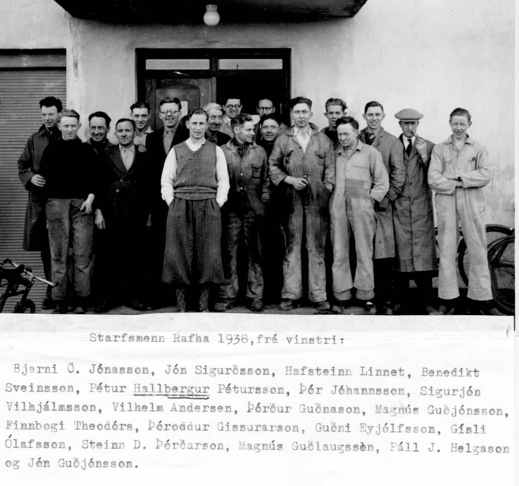 Starfsmenn Rafha stilla sér upp fyrir framan Raftækjaverslunina við Lækjargötu árið 1938.fyrstu frá vinstri er: Bjarni Ö. Jónasson, Jón Sigurðsson, Hafsteinn Linnet, Benedikt Sveinsson, Pétur Hallbergur Pétursson, Þór Jóhannsson, Sigurjón Vilhjálmsson, Vilhelm Andersen, Þórður Guðnason, Magnús Guðjónsson, Finnbogi Thedórs, Þóroddur Gissurarson, Guðni Eyjólfsson, Gísli Ólafsson, Steinn D. Þórðarson, Magnús Guðlaugsson, Páll J. Helgason og Jón Guðjónsson.