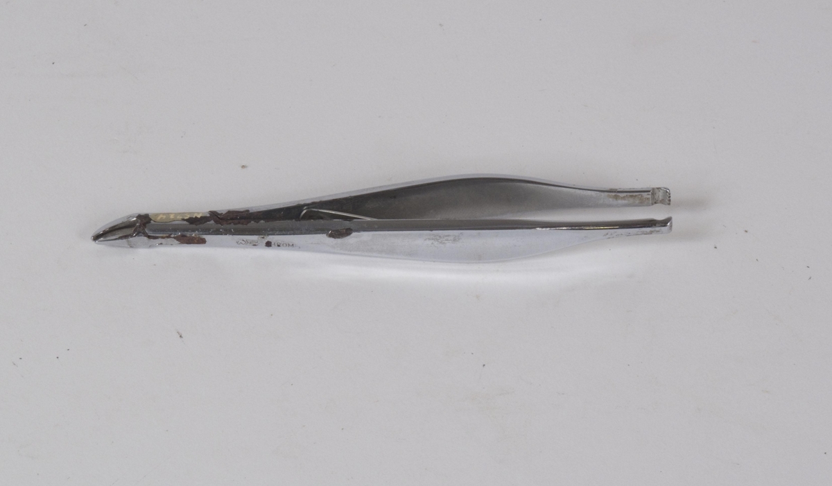 Michael klemmutöng. Krómuð og merkt: CHROM REMEDIA. Aesculap I, B-5156 Wundnahtpinzette nach Michael mit Zängchen zum Abnehmen der Michaelklammern. Úr eigu Lárusar Jónssonar læknis (sjá: Blöndal/Jónsson I 1970, bls. 536).