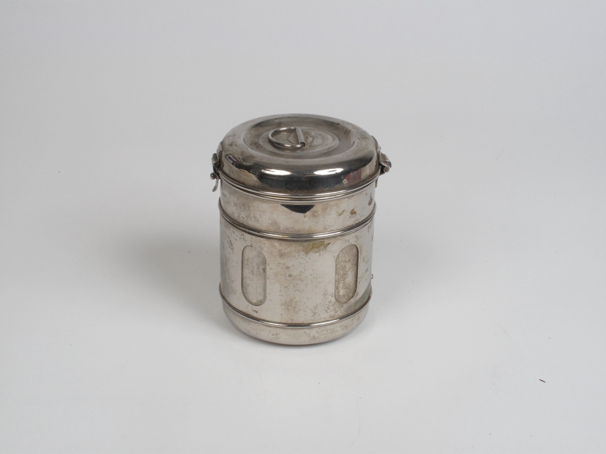 Sívalur autoklav-baukur. Krómaður og ekkert framleiðandamerki. Úr eigu Lárusar Jónssonar læknis.