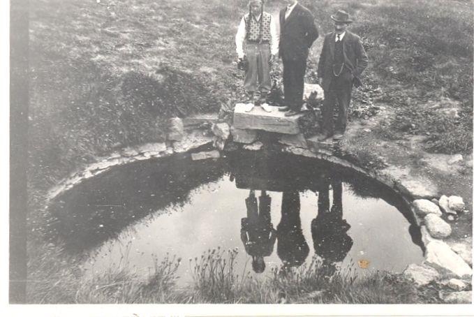 Svarthvít mynd. Þrjár manneskjur standa við Snorralaug í Reykholti. Konan er Hrefna Arnadóttir.