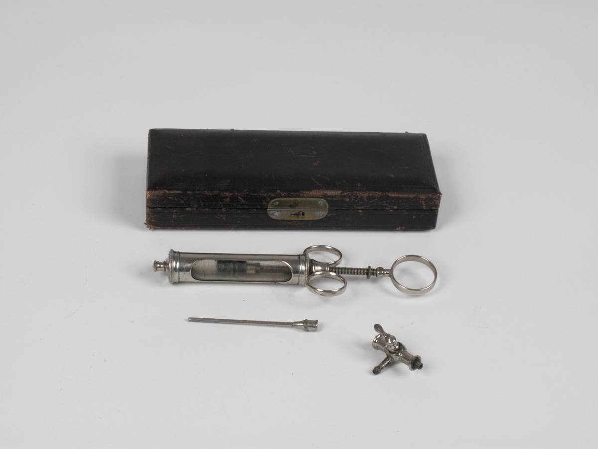 Svartur skinnklæddur stokkur, 16.5 x 6.4 x 2.7 cm, fóðraður ljósbrúnu skinni. Sömu gerðar og NS-239. Í honum er A) 10 ml krómuð sprauta með glerbol, og stuttum stút með skrúfugangi, með áskrúfuðu vari. B) Three-way stopcock C) Kanyla, oddlaus. Rúm fyrir þrjá hluti sem vantar nú. Úr eigu Valdemars Steffensen læknis á Akureyri. Jón Steffensen afhenti Nesstofusafni 11.05.1981.