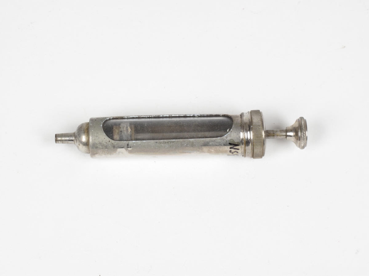 Dæla, krómuð með glerhólk innan í, en mælieiningar 1 - 10 ml eru merktar á málmhólkinum og er skorið úr honum svo gelrið sjáist. Ekkert framleiðandamerki. Úr eigu Torfa Bjarnarsonar læknis. Sjá: Blöndal/Jónsson I 1970, bls. 756. Áður í eigu Friðjóns Jenssonar læknis. Sjá: Blöndal/Jónssonar I 1970, bls. 238.