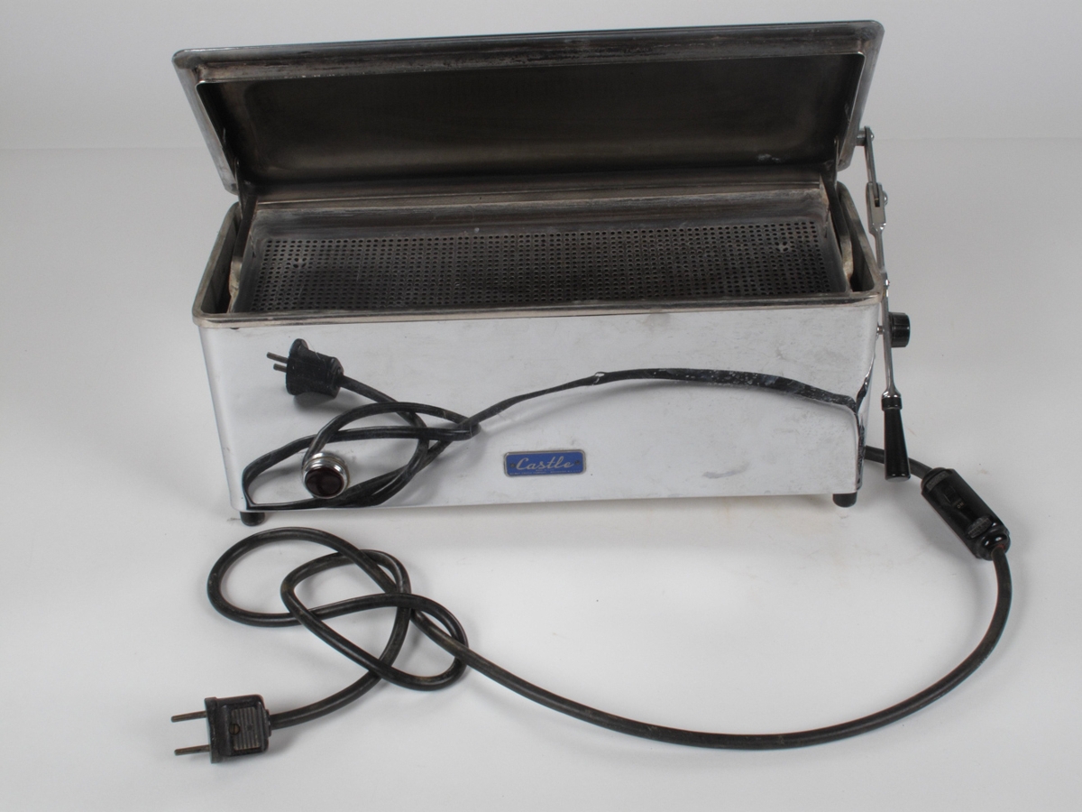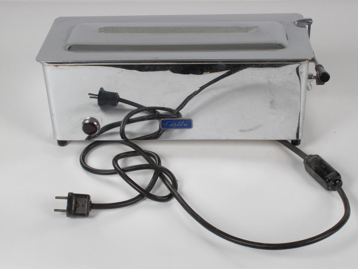Rafmagnssuðupottur fyrir læknatæki, krómaður og ál 3/4 cm fótum. Castle Wilmot Castle Company, Rochester, N.Y. Tæki úr Elliheimilinu Grund.