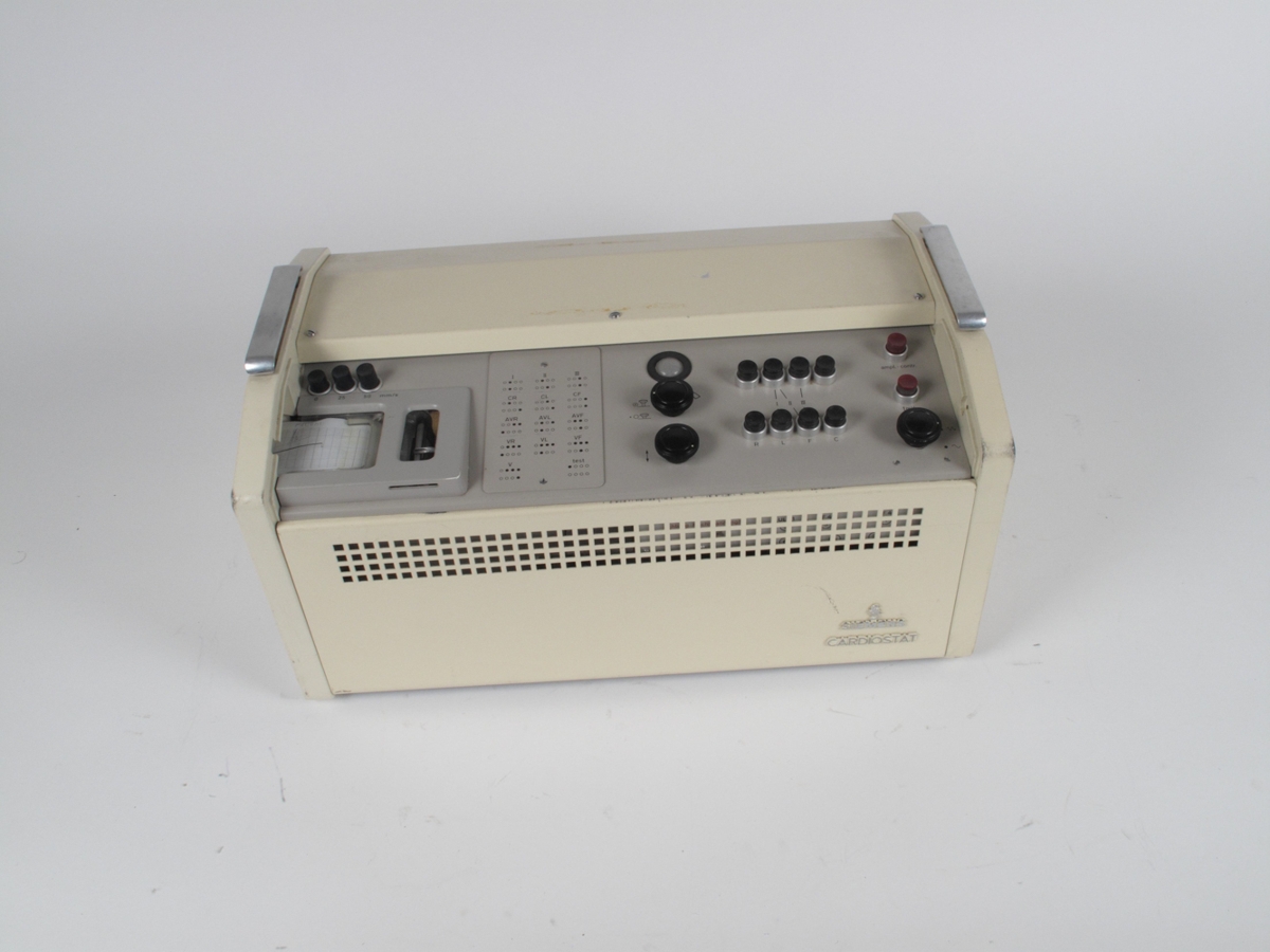 Elektrokardiograf. Í rjómalitaðri málmumgjörð (45 x 26.5 x 19/21 cm). Merktri: SIEMENS/ CARDIOSTAT með tveim krómuðum höldum og hlífðarpoka úr vaxdúk. Allar leiðslur vantar. Tæki úr Elliheimilinu Grund.