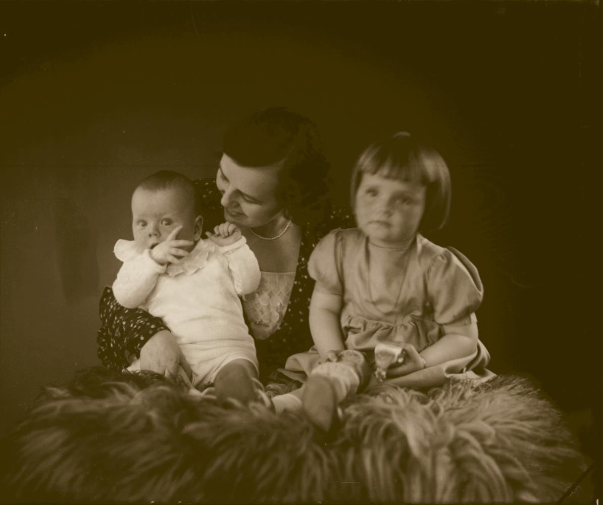 623. Fjölskylda. Móðir og börn. Spariklædd. Sitja á gæru. Glerplata nr.852. Mynd tekin Maí 1932. Frú Kampmann, skráð fyrir mynd.