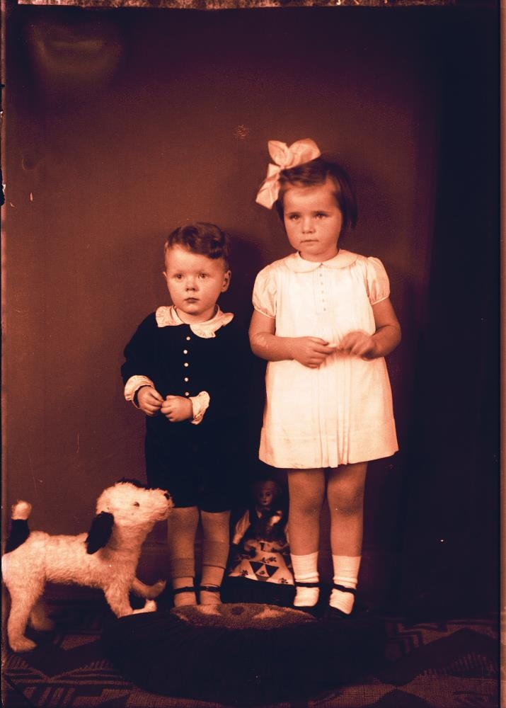 Drengur og stúlka stilla sér upp fyrir ljósmyndarann. Drengurinn klæddur dökkum stuttbuxum og jakka með hnöppum og blúndukanti í hálsinn. Stúlkan í stuttum ljósmum kjól með hárborða og í svörtum bandaskóm. Á gólfinu er leikfangahundur og brúða í íslenskum þjóðbúningi.