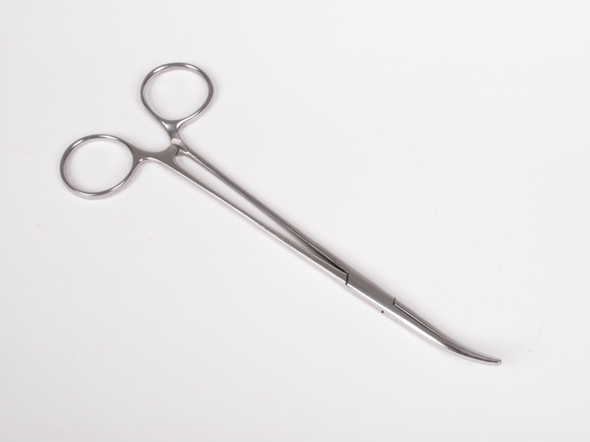 Æðatöng Adson, bogin, hjörur: D. Merkt: MEDICAL SUPPLY LONDON STAINLESS STEEL. Gerð: Aesculap I, B-18146 Arterienklemme nach Adson, slank , aufgebogen. Baldur Johnsen læknir afhenti 3.10.1984. Úr geymslu L.Í. Var í NS-2143.