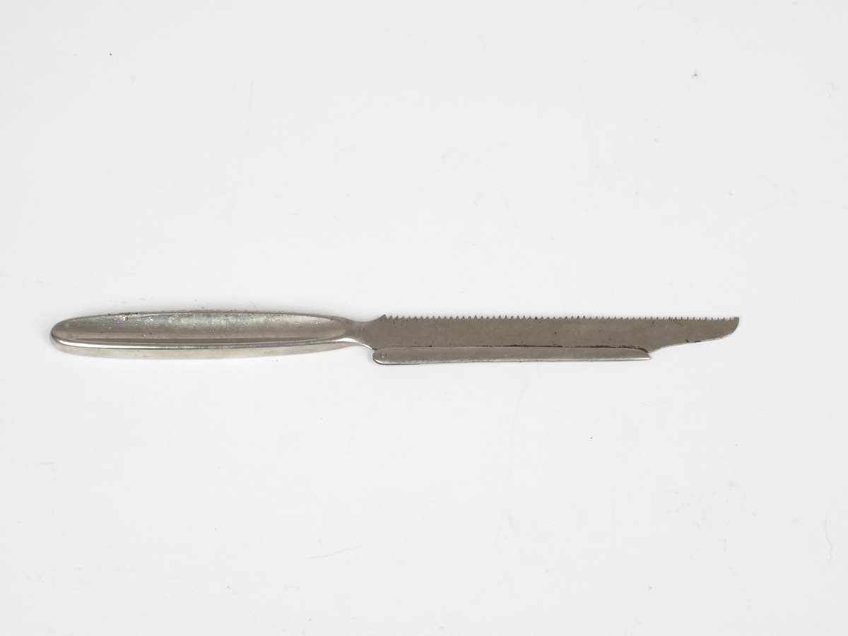 Blaðsög af Eharriere gerð. Ómerkt. Sjá: Aesculap I, B-17070. Lengd: 21.5 sm (heildarlengd), lengd sagarblaðs: 11.5 sm. Komið af háalofti Krabbameinsfélagsins við Suðurgötu. Komið þangað frá Vík í Mýrdal.