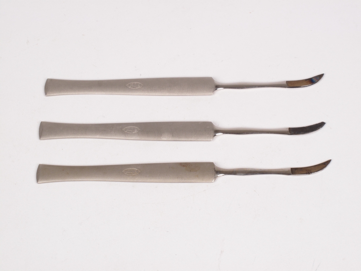 Uppskurðarhnífur, halda slétt og mött. Gerð hnífsblaðs: Aesculap I, B 16655, fig. 63. 3 stk. Merkt: STILLE A SWEDEN Erfingjar Braga Ólafssonar gáfu.