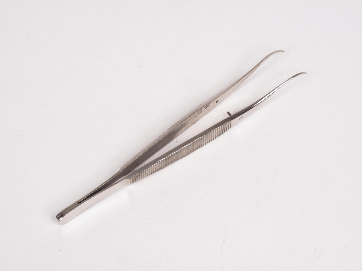 Pinsetta með mjóum, sléttum, sveigðum enda. Ómerkt, úr húðuðum málmi. Hef ekki fyrirmynd hennar. Erfingjar Braga Ólafssonar gáfu.