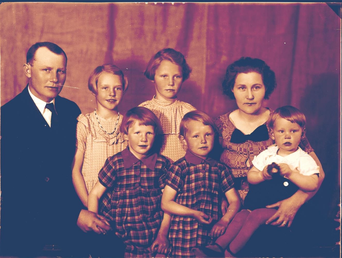 Karvel Kjartansson Ynnri Njarðvík er skráður fyrir mynd. 7 saman. Fjölskyldumynd. Maður í jakkafötum með bindi situr hjá slúlkum í eins kjólum, fyrir framan þær eru aðrar tvær stúlkur í eins köflóttum kjólum, síðan kona í flík með v hálsmáli og slaufu á barmi hún heldur á barni í tvílitri flík, sokkabuxum og bandaskóm, barnið er með leikfang. Mynd tekin í september 1937. Glerpl.nr. 3248.