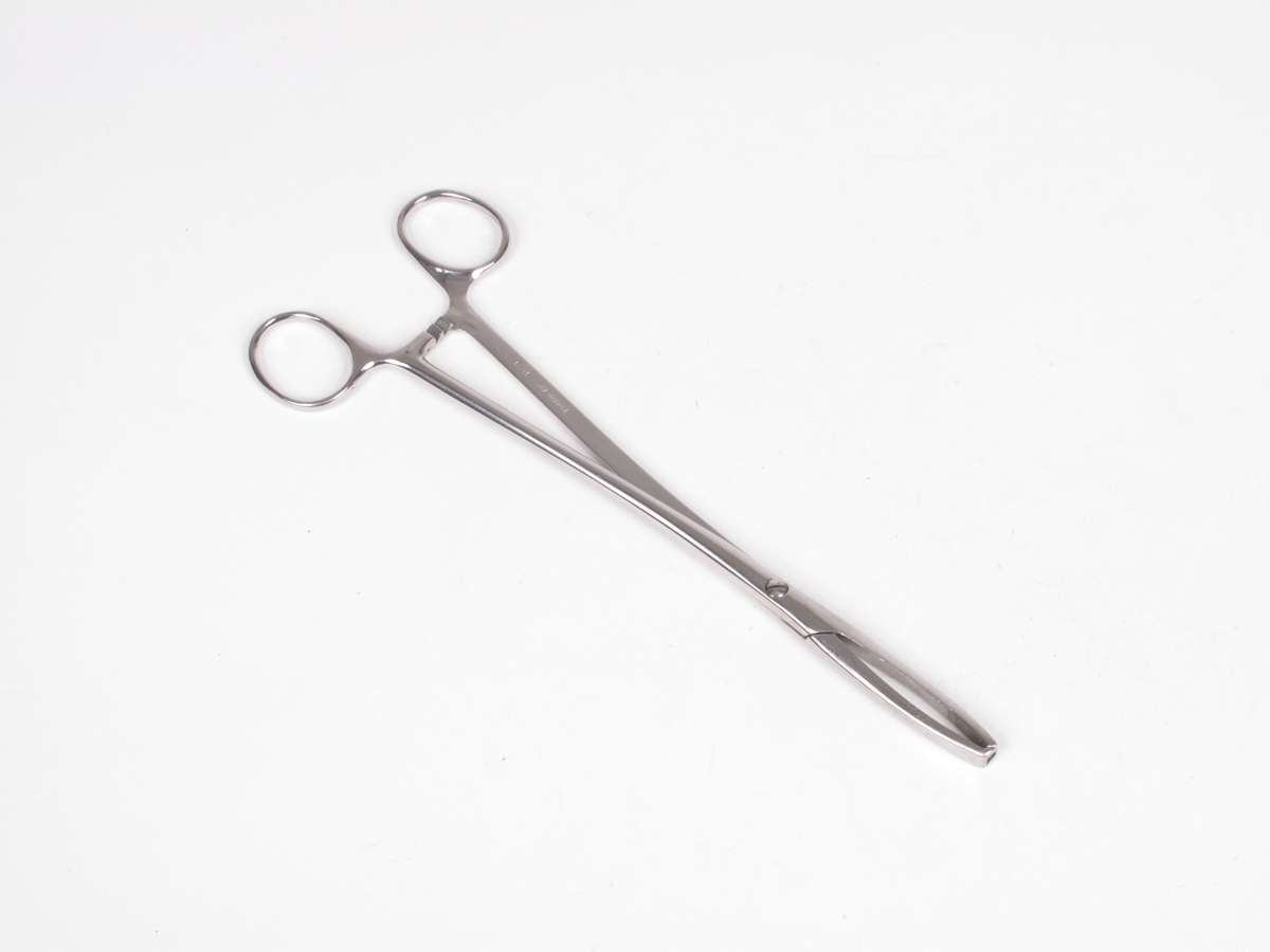 Læst gaddatöng (2x2) úr ryðfríu stáli. Hjörur S. Merkt: KRUPP-V2A 3697. Gerð: Aesculap I, F-2002 Hakenzange nach Jacobsgerade, 2x2 Zähne. Erfingjar Braga Ólafssonar gáfu.