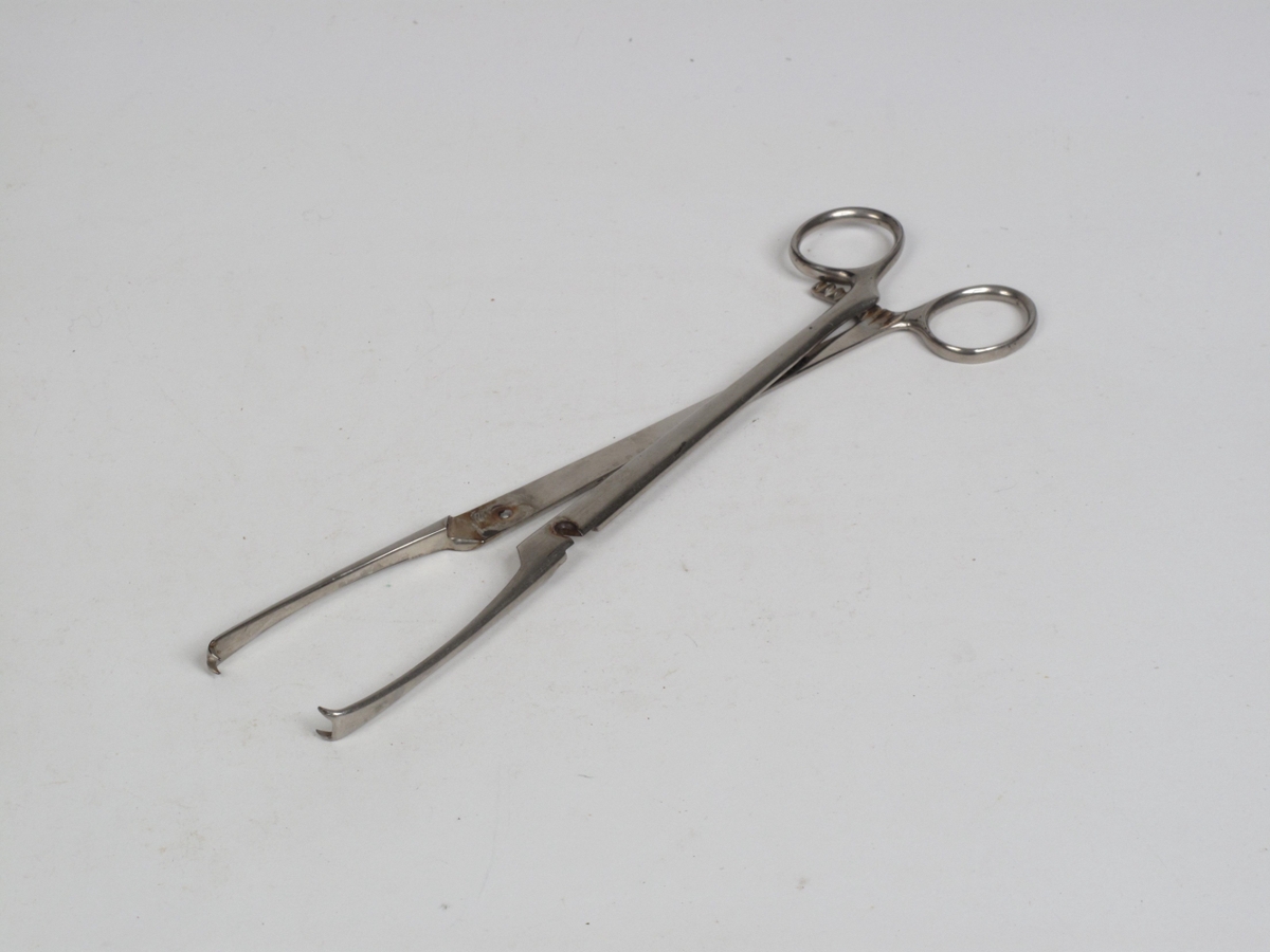 Gaddatöng Jacobs, bein, 2 x 2 tennur. Hjörur: A en hjörunagli brotinn. Merkt: PAT 5.3 92. Aesculap I, F-2002 Hakenzange nach Jacobs, gerade, 2 x 2 Zähne. Baldur Johnsen læknir afhenti 3.10.1984. Úr geymslu L.Í. Var í NS-2143.