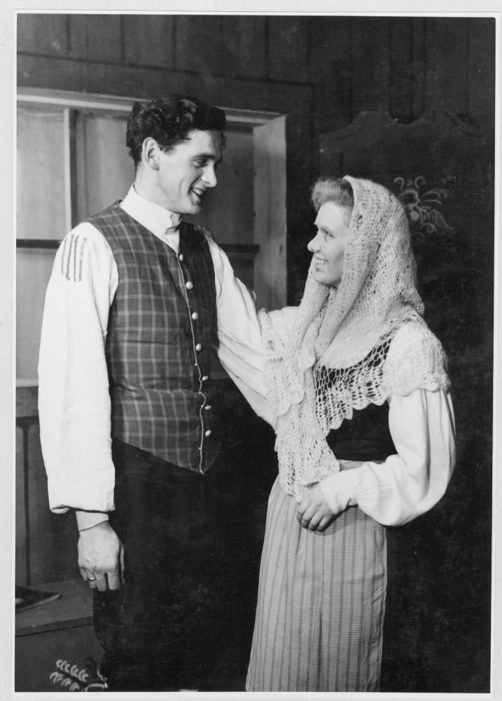 Leikfélag Hafnarfjarðar Tveir leikarar í hlutverkum sínum: Jón Kr. Jóhannesson og Kristjana Breiðfjörð.í Kinnarhvolssystur. Leikstjóri Einar Pálsson. Höfundur er Johannes Carsten Hauch , fæddur 1790. Hann andaðist 1872, þá áttatíu og tveggja ára. Hann var mikilsmetinn rithöfundur í Danmörku á sinni tíð. Leikritið var fyrsta verkið sem var sett upp í Bæjarbói en það var árið 1945.