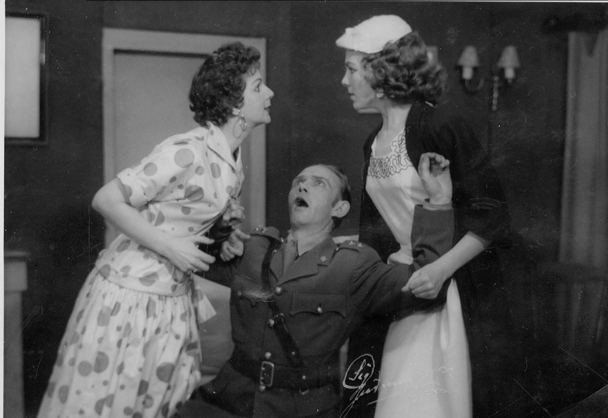Leikfélag Hafnarfjarðar. Þrír leikarar í hlutverkum sínum, frá vinstri: Óþekkt, Friðleifur Guðmundsson og Kristbjörg Kjeld.