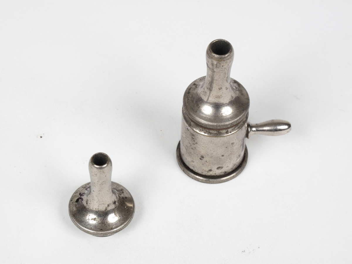 Hlustartrekt Siegle's neumatisk, úr málmi með 2 trektum, ómerkt. Aesculap C-3085 Ohrspekulum nach Siegle pneumatisch. Baldur Johnsen læknir afhenti 3.10.1984. Úr geymslu L.Í. Var í NS 2143.