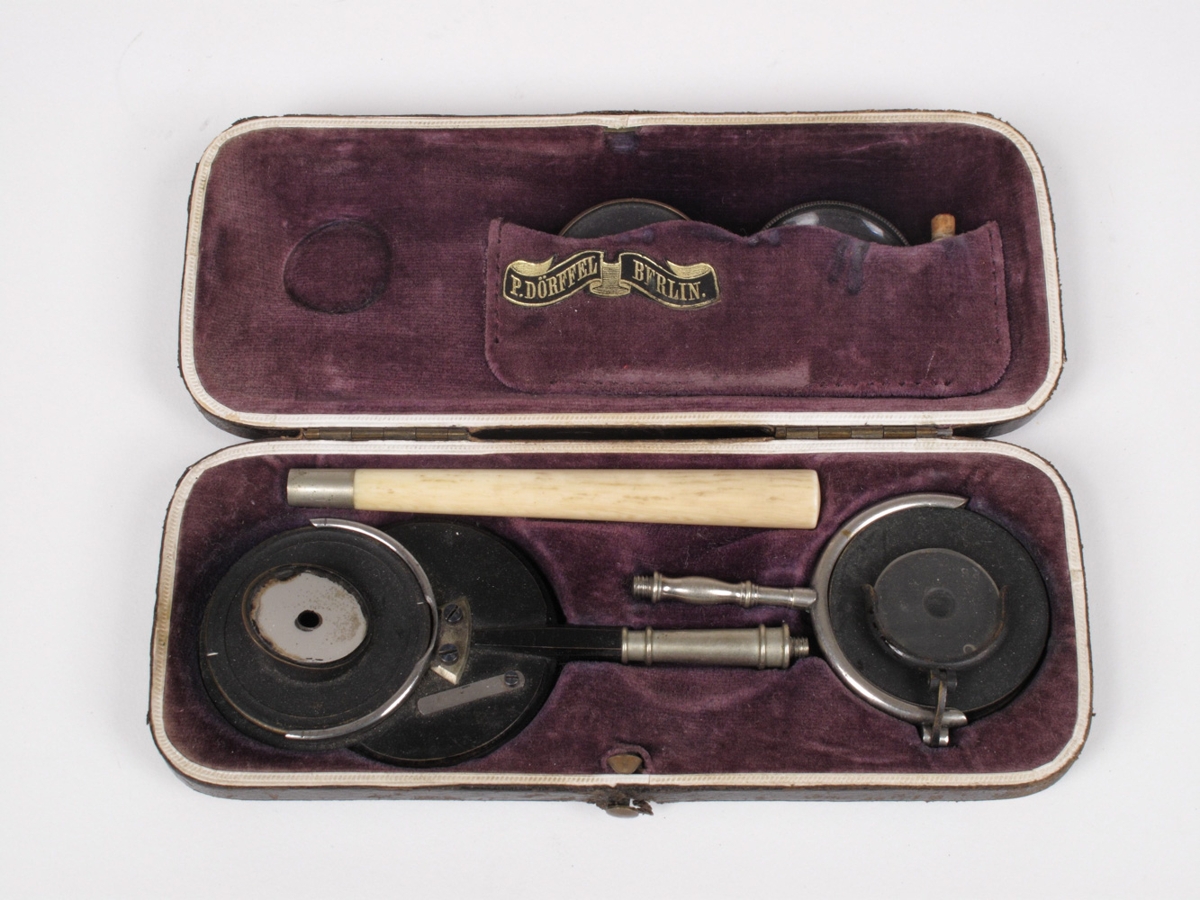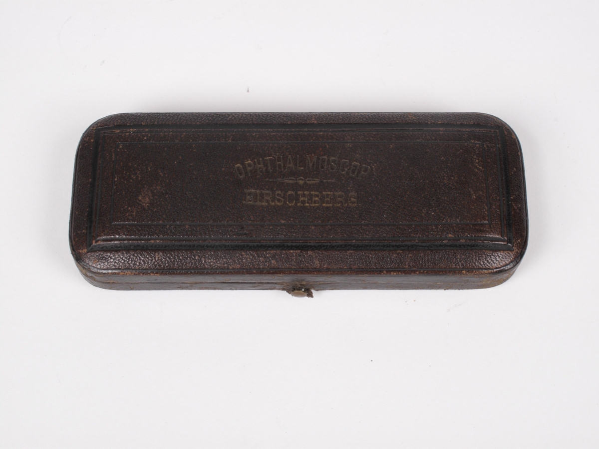 Klæddur brúnu skinni, fóðraður fjólubláu flaueli. Á lok er gylt: OPTHALMOSKOP/ - . - /HIRSCHBERG en innan á það P.DÖRFFEL BERLIN. Í stokknum er heilt beinskeft Hirschberg's opthalmoskop, nema einn speglanna er brotinn og ennfremur smástautur með homatropin......tölum. Um Hirschberg's augnspegil sjá J.Hirschberg: Die Opthalmologischin Apparati, bls. 421 í Bricht uber Wissenschaftlichen Instrumente auf der Berliner Gewerbrausstellung im Jahra 1879, Berlin 1880. Börn Hannesar Guðmundssonar læknis gáfu.