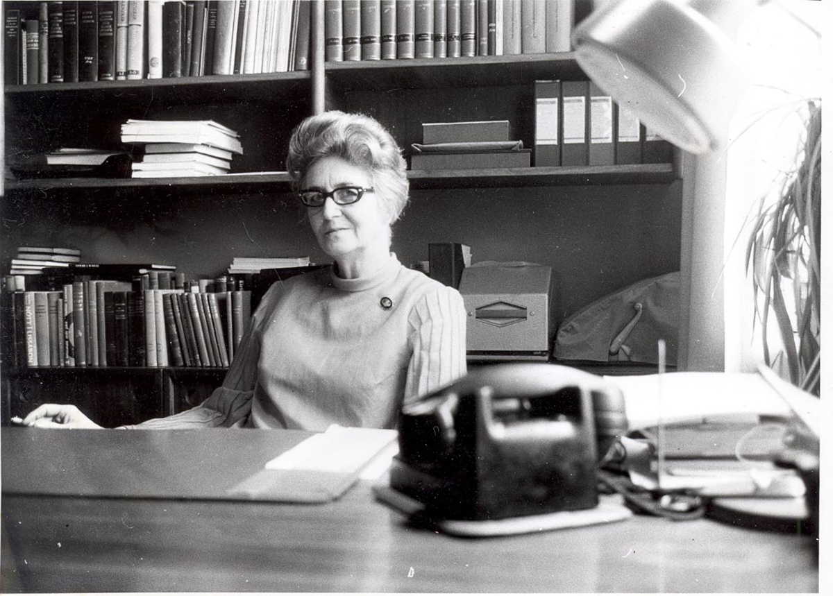 Myndin gæti verið tekin í tilefni af stofnfundi Bókavarðafélags Ísland í Bókasafni Hafnarfjarðar Mjósundi 10, 4. desember 1960. Nefndin bauð uppá kaffi og kökur. Anna Guðmundsdóttir situr við skrifborð á skrifstofu sinni,