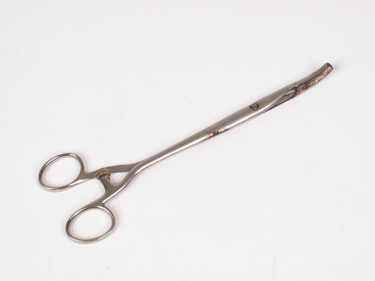 Lífhimnutöng Mikulicz með skarpri beygju, hjörur: A, úr húðuðum málmi, ómerkt, ryðguð. Aesculap I, B-18246 Peritoneum-Klemme nach Mikulicz, stark aufgebogen.