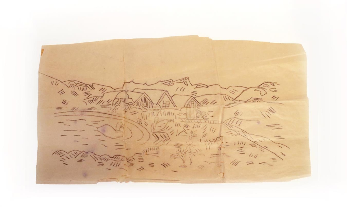 Mynsturblað fyrir útsaum. Mynstrið, sem teiknað er með blýanti á ljósan maskínupappír, er bustabær, fjöll, tún, tjörn og svanir á tjörninni. Mynsturblaðið er úr fórum Hönnu Martinu (Jacobsen) Sigurgeirsson, en hún var móðir gefanda. Hanna Martina var færeysk, kom til Íslands og vann á Vífilsstöðum, í matstofu og setustofu, og kynntist þar föður gefanda, Gunnari, sem þá var sjúklingur þar. Mynstrið er teiknað af Árnýju Filippusdóttur, stofnanda húsmæðraskóla í Hveragerði. Gefandi telur að mynstrið sé einnig hannað af Árnýju. Árný gaf Hönnu blaðið, líklega árið 1939, þegar foreldrar gefanda voru í Hveragerði. Blaðið hefur verið brotið saman og er orðið viðkvæmt á brotunum og sums staðar farið að rifna lítillega. Ofan í teikninguna hefur verið farið oftan en einu sinni með blýanti.