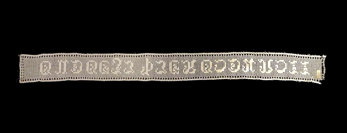 Milliverk úr sængurveri, heklað úr hvítu bómullargarni, með GUÐ GEFI ÞJER GOÐA NOTT. Það er örlítið farið að slitna til endanna og í því eru smávægilegir blettir en annars er það í góðu ástandi. Gefandi veit ekki hver heklaði milliverkið né hvaðan það er komið, en það hefur lengi verið í hennar fórum.