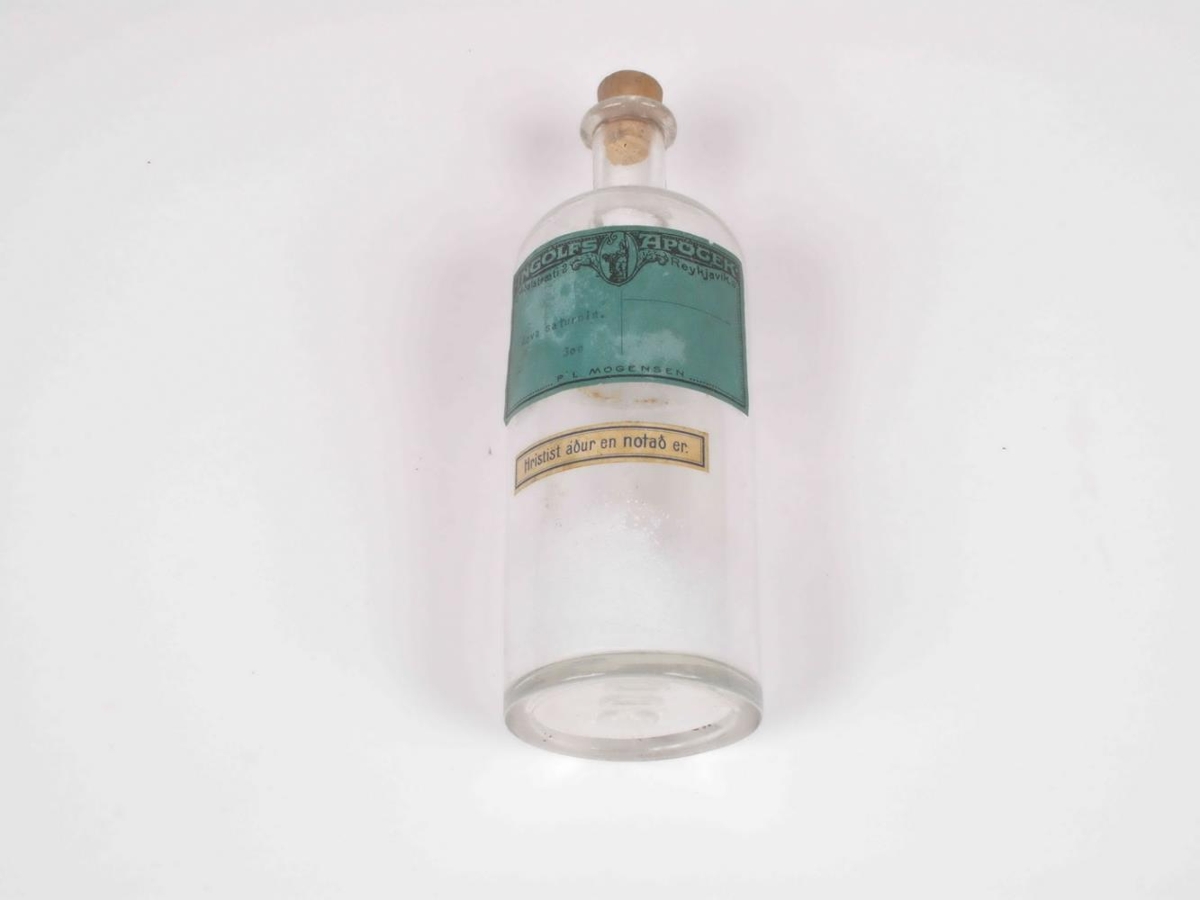 Lyfjaglas, sívalt, ólitað, með korktappa og bláum merkimiða Ingólfs Apótek/ Aqva saturnin. 3va P.L. Mogensen og hvítum miða Hristist áður en notað er á botni er 300.