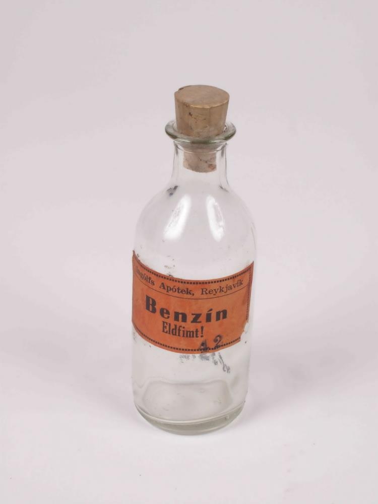 Lyfjaglas, sívalt, ólitað, með korktappa og rauðum merkimiða sem á er prentað Ingólfs Apótek, Reykjavík/ Benzín/ Eldfimt!. Á botni x/ 100 K 5115.