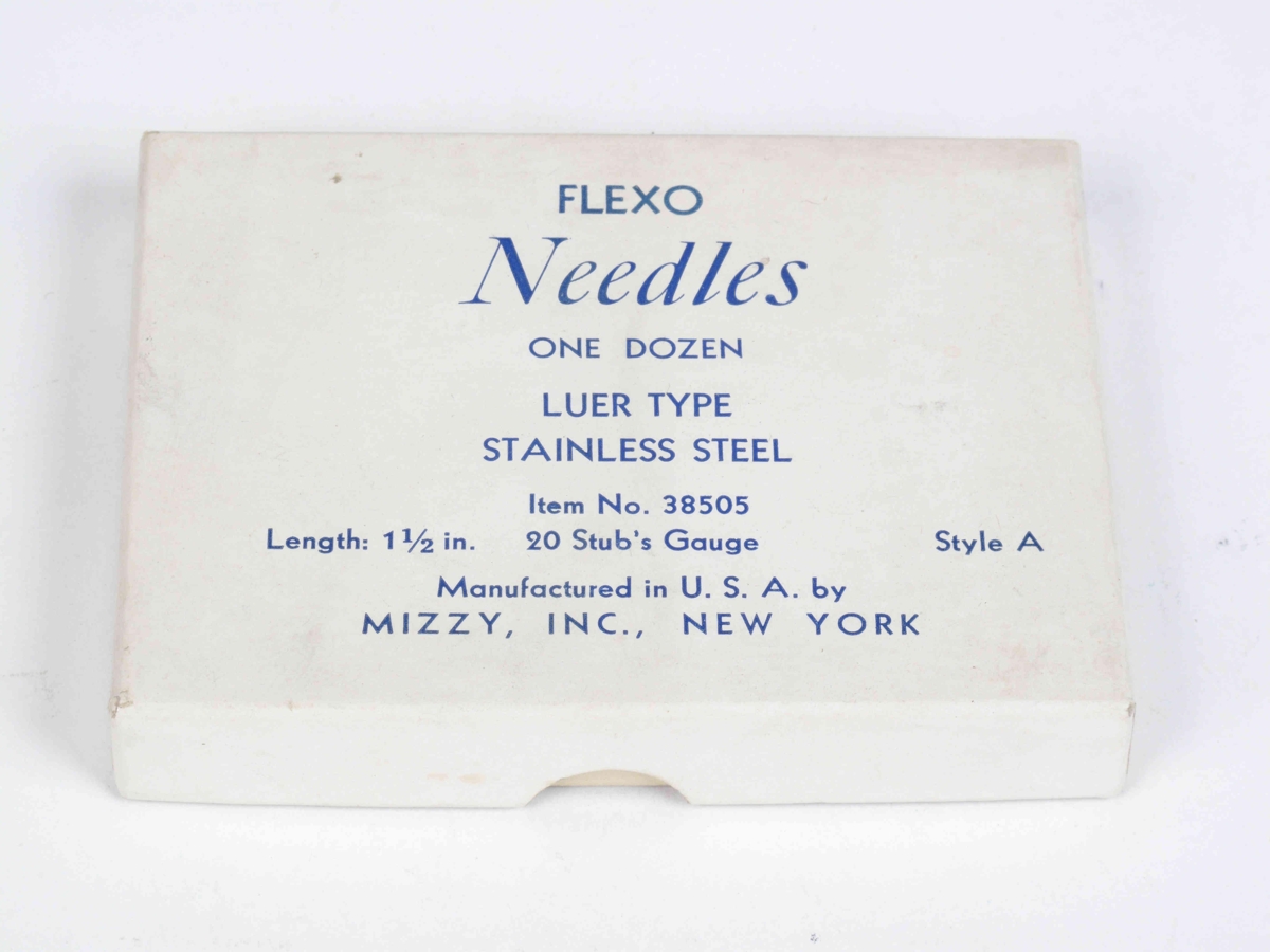 Húðbeðsdælunálar, merkt: Flexo/ Needles/ Luer Type í pappakassa.