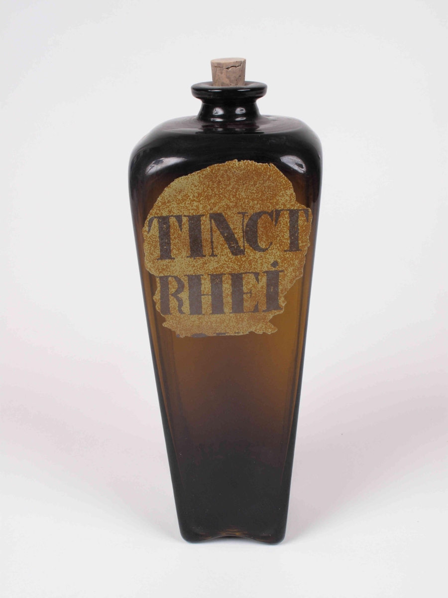 Ferstrend flaska úr dökkbrúnu gleri, sem breikkar upp, með korktappa, áletruð: TINCT/ RHEI, merkt á botni HG83. Frumgerðin er í kjallara medicinsk-historisk museum.